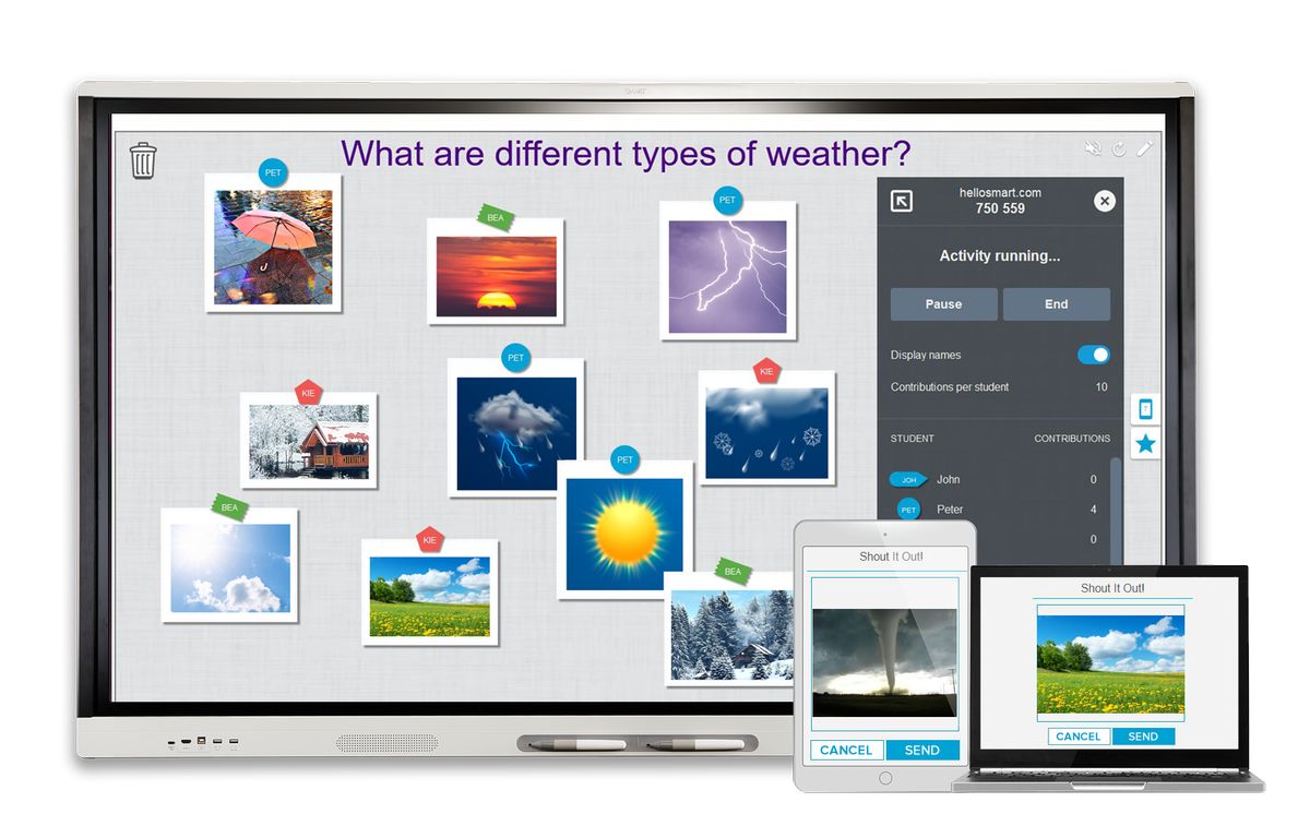 Возьмите любой стилус из магнитного лотка и начните писать или рисовать на панели. Делитесь всем, что вы пишите, с 250 устройствами, находящимися в любой точке мира! Ученики, подключившиеся к доске дистанционно, также могут оставлять записи. После завершения работы результат можно сохранить в формате PDF.