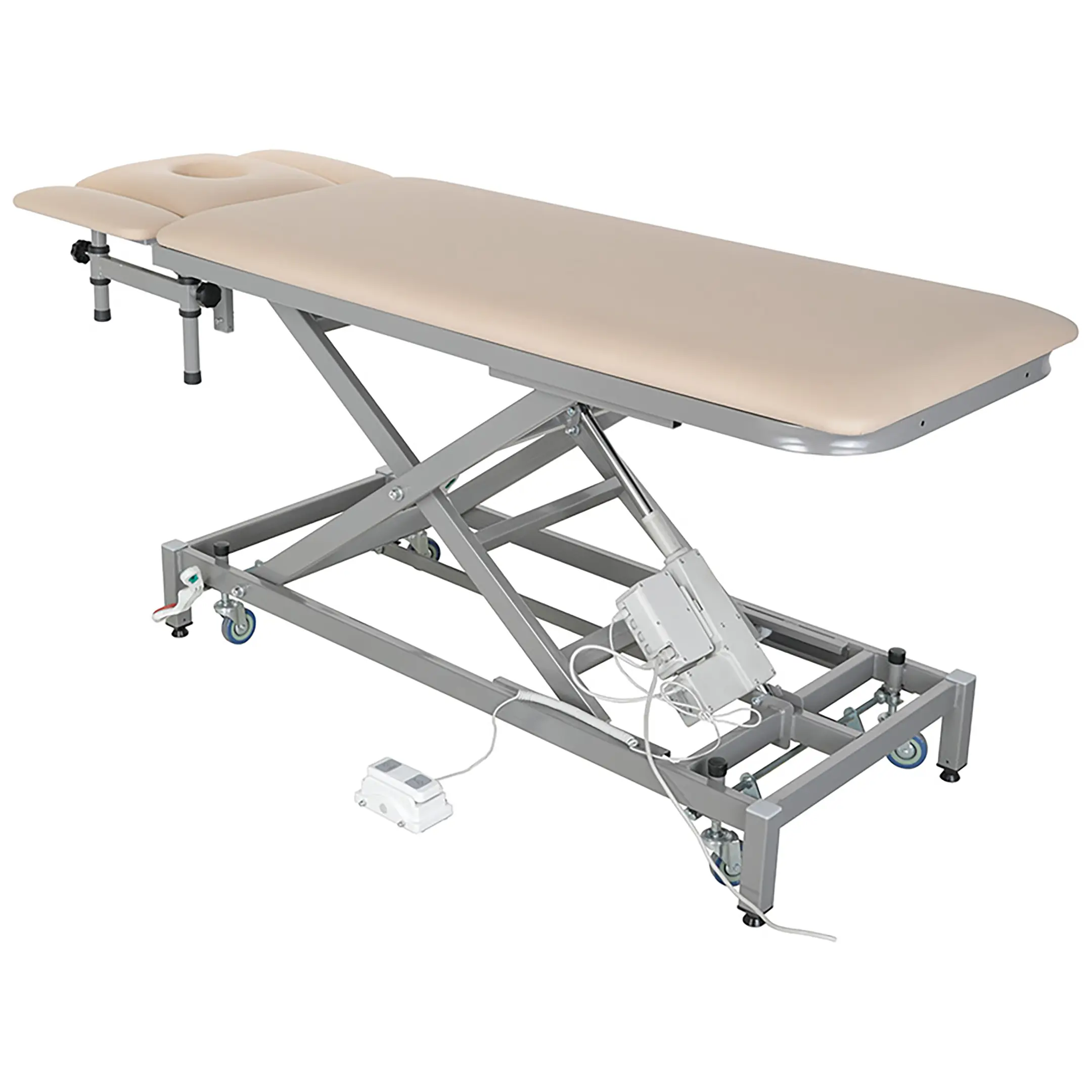 • массажный стол установлен на 4 регулируемые опоры с возможностью перехода на самоориентирующиеся колеса, ∅ 75 мм, из немаркой серой резины, не оставляющего следов на полу для перемещения стола;