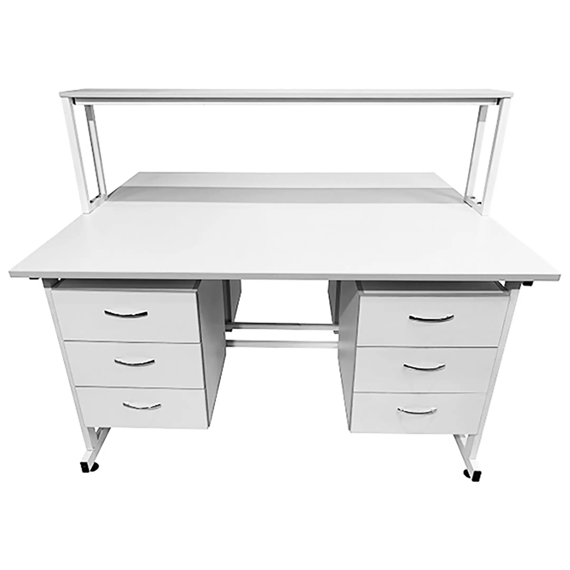 Стол лабораторный островной с надстройкой Сло 22.011 (белый) — это идеальное решение для организации сразу двух рабочих мест в лабораториях и медицинских учреждениях. Модель обеспечивает рациональное использование пространства и максимальный комфорт для сотрудников. Каждое рабочее место оснащено двумя подвесными тумбами с тремя выдвижными ящиками, а центральная надстройка имеет одну полку. Каркас выполнен из стального профиля, столешницы из ЛДСП толщиной 22 мм.