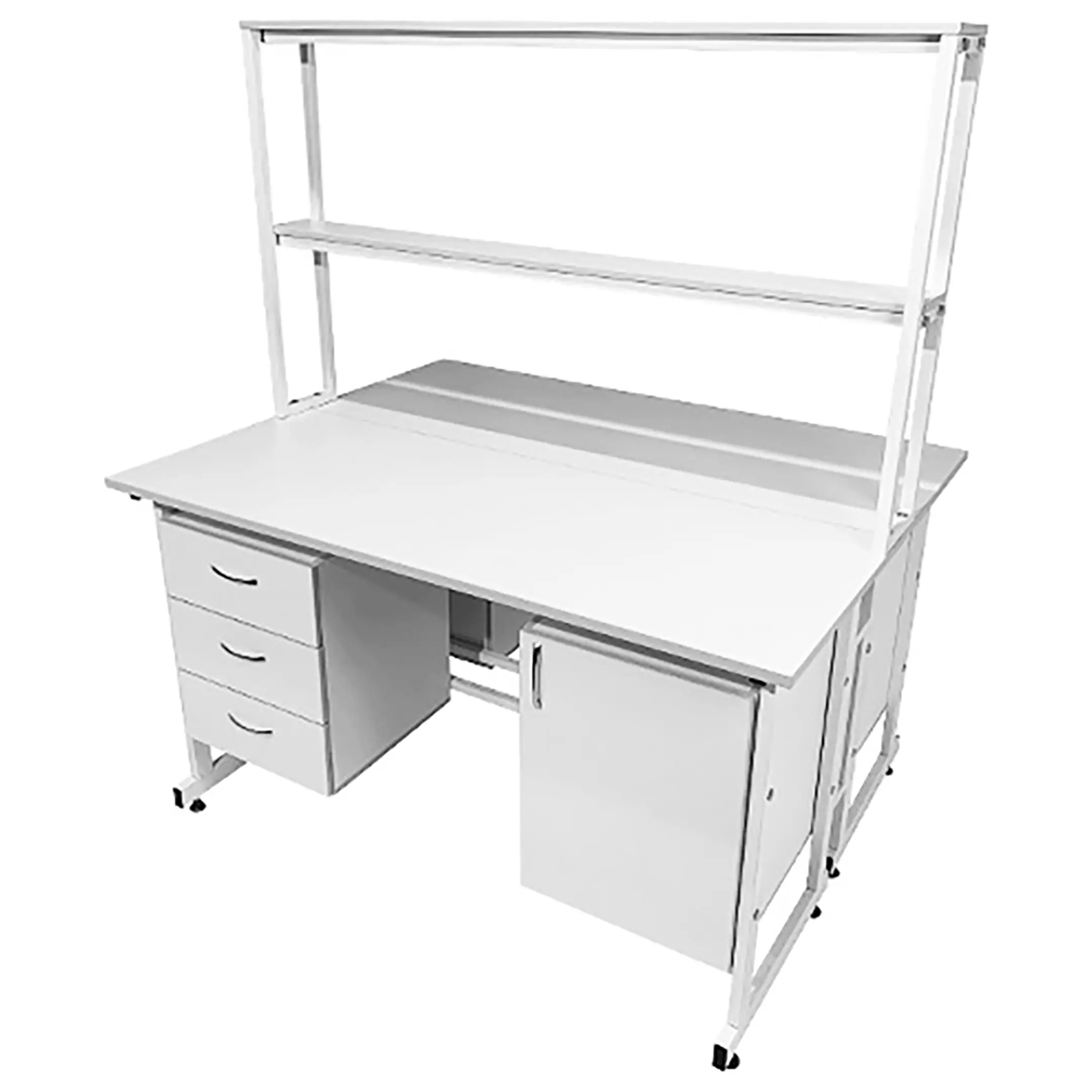 Стол лабораторный островной с надстройкой Сло 22.018 (белый) — это прекрасное решение для организации сразу двух рабочих мест в лабораториях и медицинских учреждениях. Модель оснащена двумя рабочими местами, каждое с двумя подвесными тумбами: слева с тремя выдвижными ящиками, справа с распашной дверкой и полкой, а также центральной надстройкой с двумя полками. Каркас выполнен из стального профиля, столешницы из ЛДСП толщиной 22 мм.
