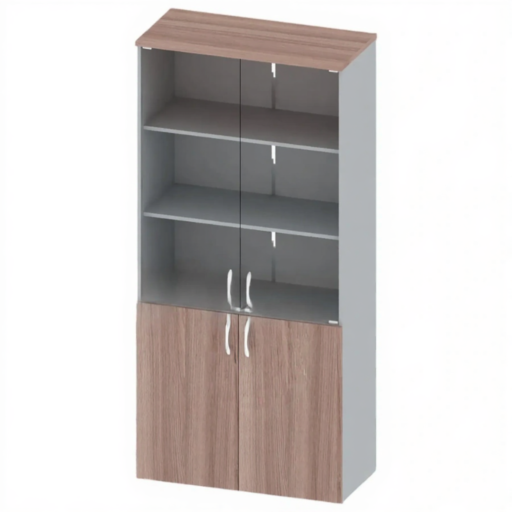 Шкаф для документов канцелярский, стекло, 1950 мм ОФ-СТ-104-4 — это вместительное и эстетичное решение для хранения документов, книг и канцелярских принадлежностей в образовательных, офисных и административных учреждениях. Модель высотой 1950 мм имеет усиленную конструкцию с использованием ЛДСП толщиной 16 и 22 мм, оснащена двумя глухими дверками с замком и двумя стеклянными, 4 полками и дном, регулируемыми опорами.