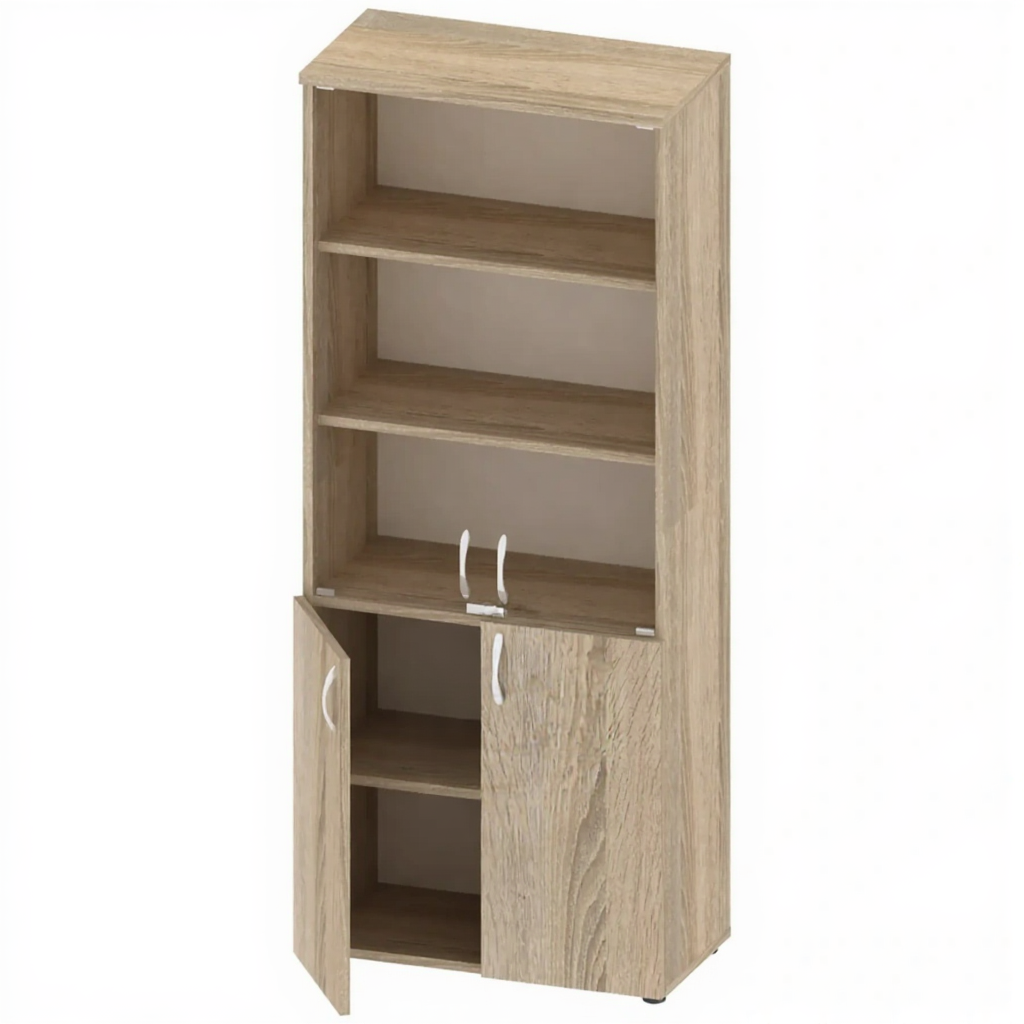 Шкаф для документов канцелярский, стекло, 800 мм, ШК-АД-117-3 — это вместительное и эстетичное решение для хранения документов, книг и канцелярских принадлежностей в образовательных, офисных и административных учреждениях. Модель имеет усиленную конструкцию из ЛДСП толщиной 22 мм с топом 25 мм, оснащена стеклянными вставками без рамы и регулируемыми опорами.
