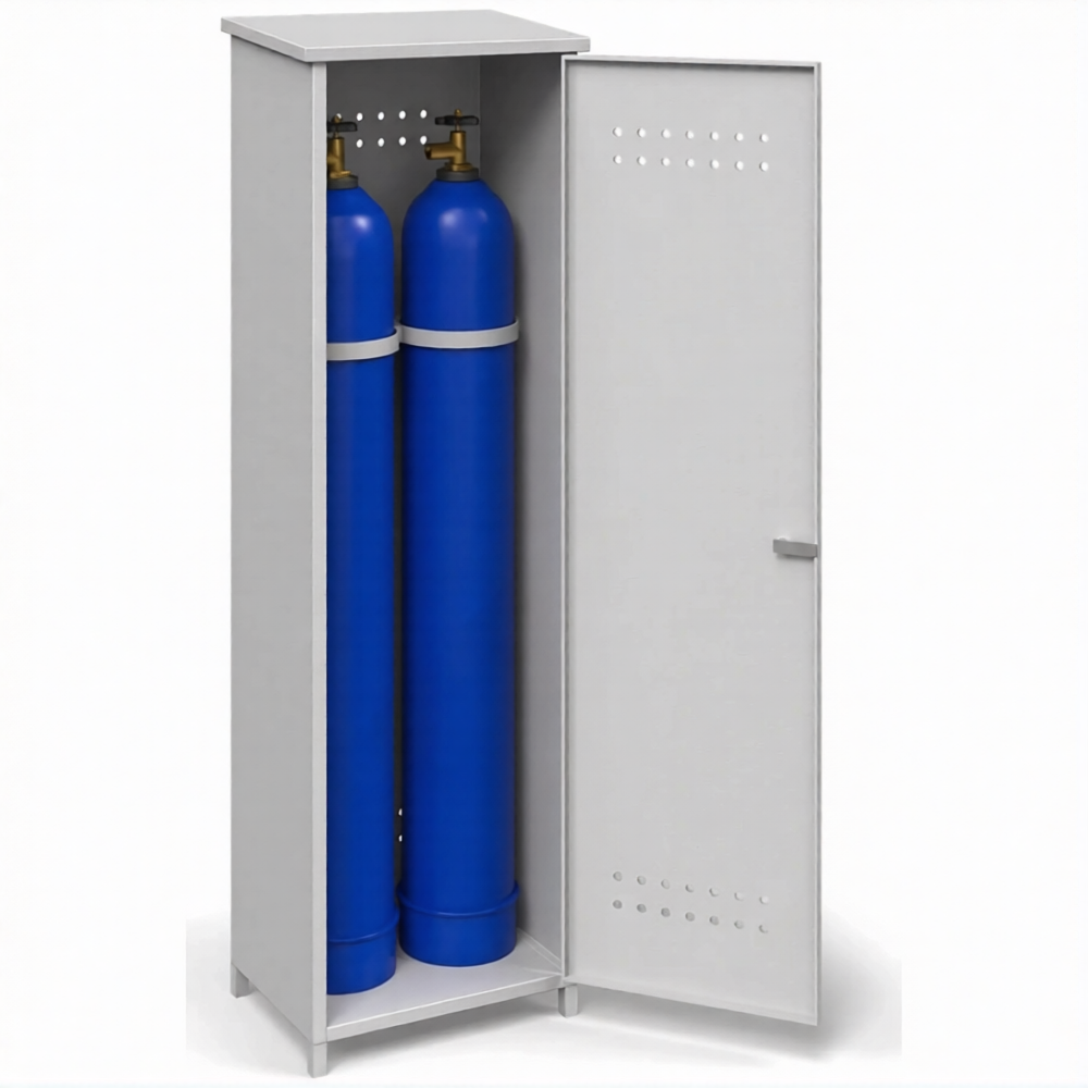 - Специализация для баллонов большой емкости — шкаф разработан с учетом габаритов и массы стандартных 40-литровых баллонов. Его внутреннее пространство, конструкция и система фиксации обеспечивают безопасное и устойчивое вертикальное хранение двух таких баллонов, что является стандартом для большинства промышленных сварочных постов и систем газоснабжения.