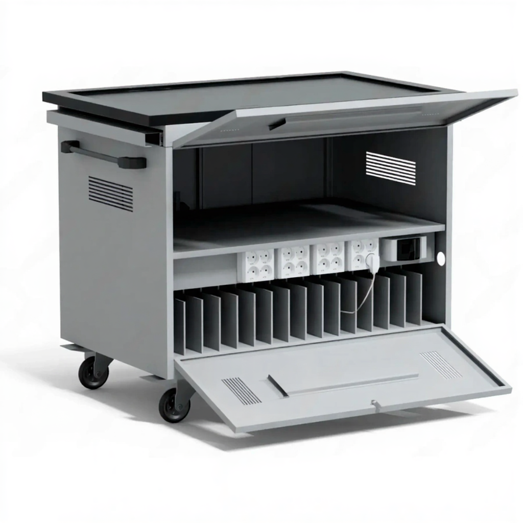 - Экономия времени и простота обслуживания — полностью устраняет проблему поиска свободных розеток и отслеживания заряда каждого ноутбука. Администратору достаточно подключить тележку к сети, чтобы утром получить полностью готовый к работе комплект.