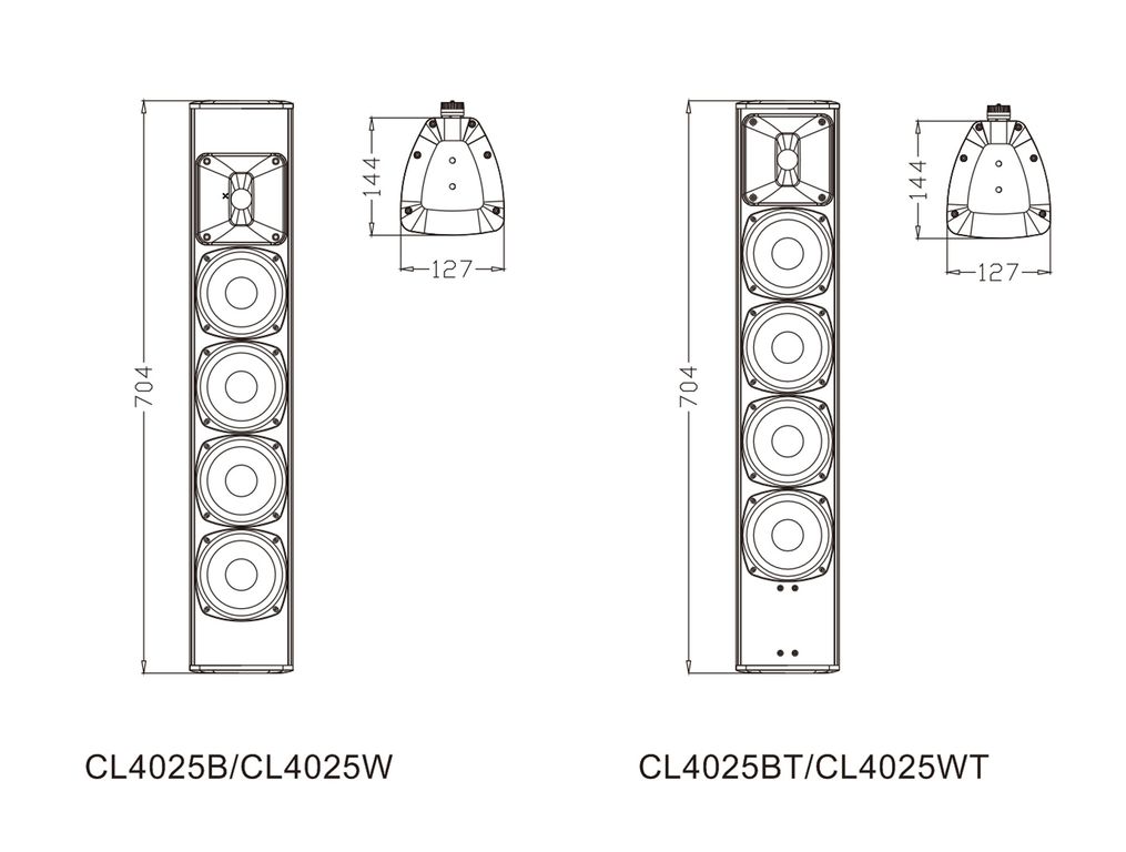 Серия CL4025 представляет собой акустическую систему колонного типа с различными цветами и функциями. Продукт соответствует стандарту IP56. Звук мягкий и сбалансированный. Корпус изготовлен из алюминиевого сплава. Буквы B и W после модели обозначают черный и белый цвет соответственно, а буква T представляет собой конфигурацию с трансформатором.